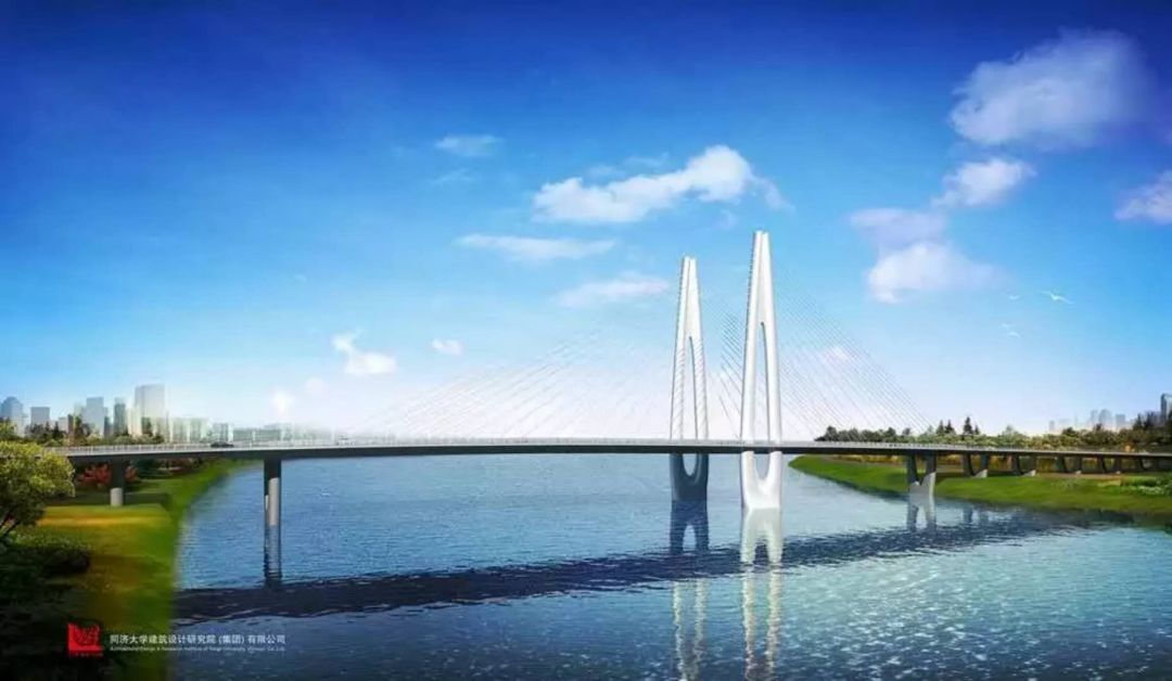大橋呈南北走向,全長(zhǎng)1735m,其中橋梁長(zhǎng)度1127m,大橋北側(cè)接線道路全長(zhǎng)290m,南側(cè)接線道路全長(zhǎng)318m。